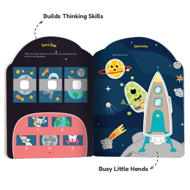 3+ years, 48 pages, SPACE ODYSSEY Super Activity Book is an out-of-this-world adventure filled with activities like tracing, matching, odd one out, spot the differences, and creative drawing. Perfect for sparking curiosity and enhancing focus, hand-eye coordination, and early learning skills. A fun and educational journey through space for young explorers!