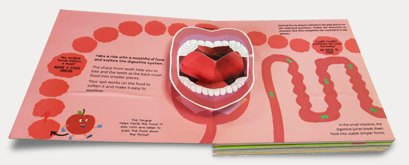 3+ Years, 24 Pages,an unique 3D Pop-up book with playmat, stand-up play pieces, and game.